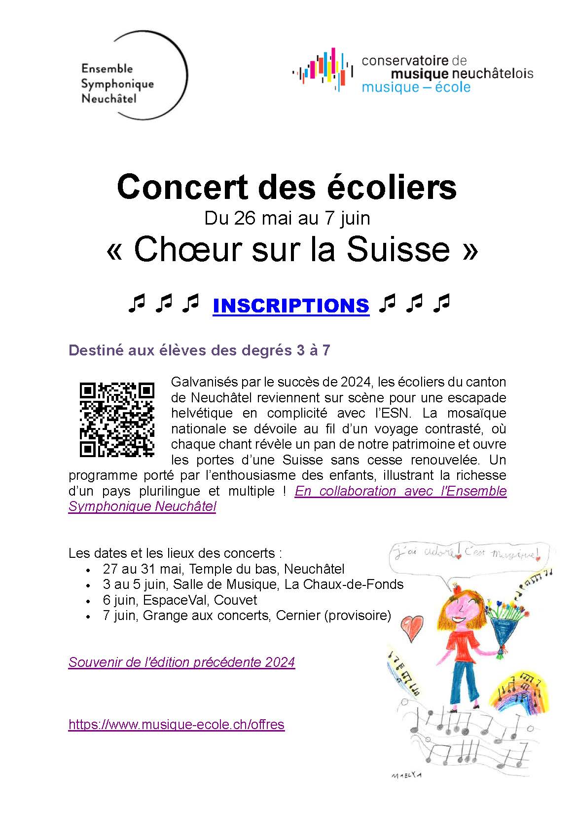 Concerts des écoliers avec l'Ensemble Symphonique Neuchâtel - Du 27 mai au 7 juin 2026 - « Chœur sur la Suisse »