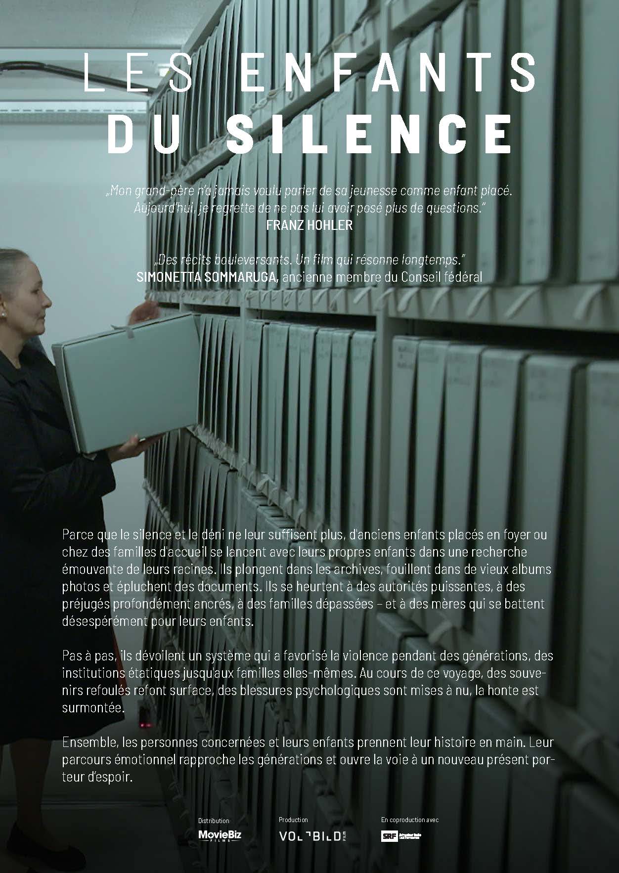 Nous avons le plaisir de vous informer de la sortie en salles du documentaire LES ENFANTS DU SILENCE de Corinne Kuenzli, le 18 mars 2026 en Suisse romande. À partir du 14 mars 2026, de nombreuses avant-premières du film auront lieu en présence de la réalisatrice. Elle sera accompagnée de personnes concernées par le placement extra familial et d'expertes qui ont travaillé sur l'un des plus grands scandales de l'histoire suisse et ont permis de faire la lumière sur cette affaire. Jusque dans les années 1980, des centaines de milliers d'enfants ont été placés en institution ou chez des familles d'accueil en Suisse, ce qui a déchiré leurs familles. Les traumatismes des personnes concernées perdurent encore aujourd'hui.
